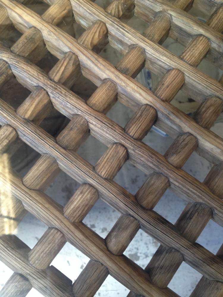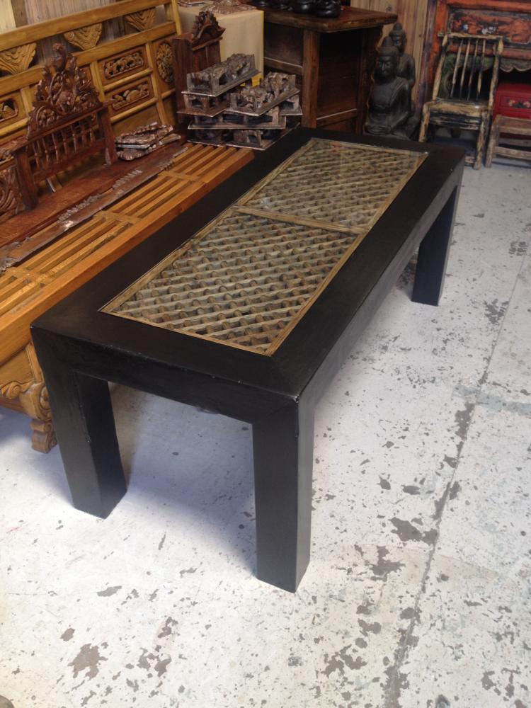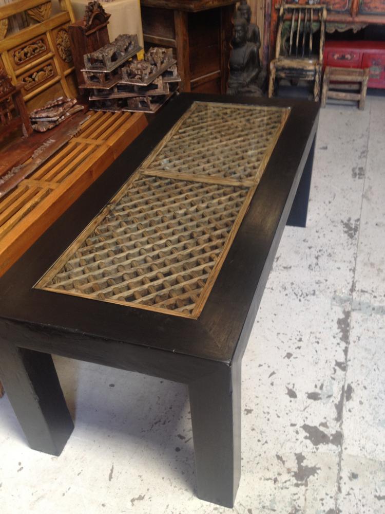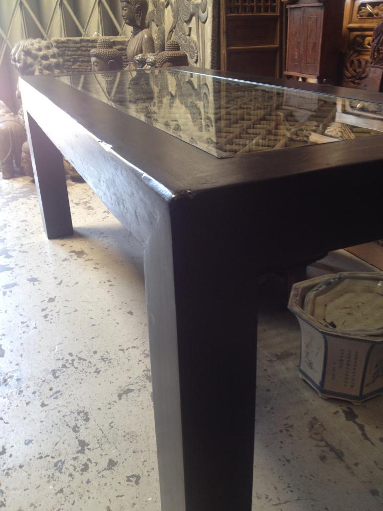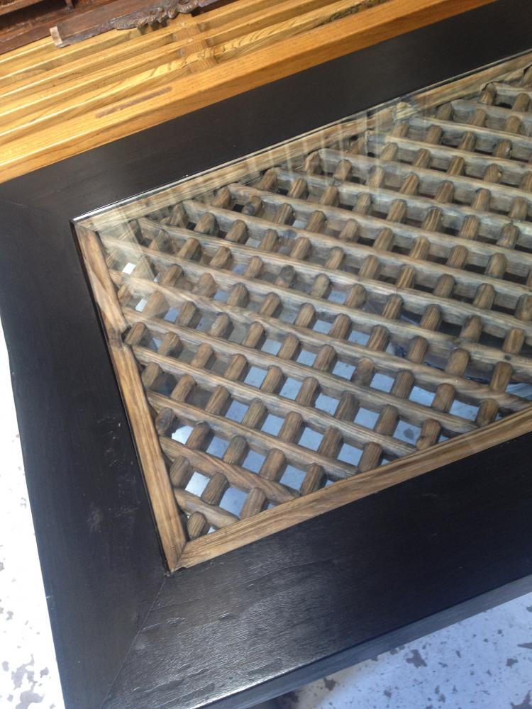 Made from reclaimed elm and finishe in an ebobony stain. Glass top over 2 antique window panels (c 1900)
