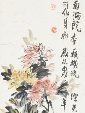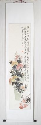 Original watercolour depicting chrysanthemum flowers and foliage. Watercolour painting on painting parchment mounted on subtly pattened and textured, white coloured mount. Painted and signed by artist Yiren.