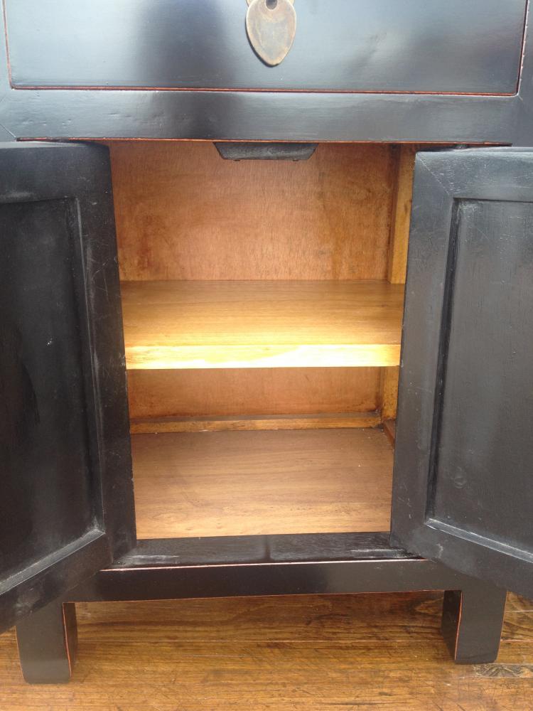 Small reproduction bedside cabinet with cupboard and shelf inside and single drawer above. Made to a very high standard and finished in high gloss black lacquer.
