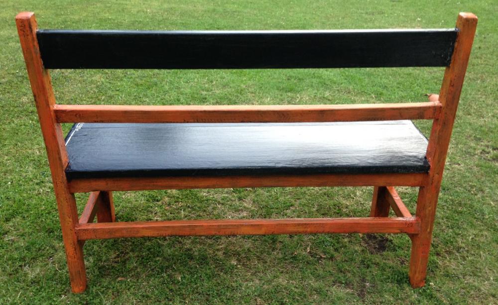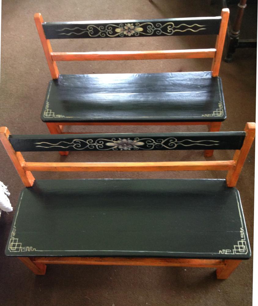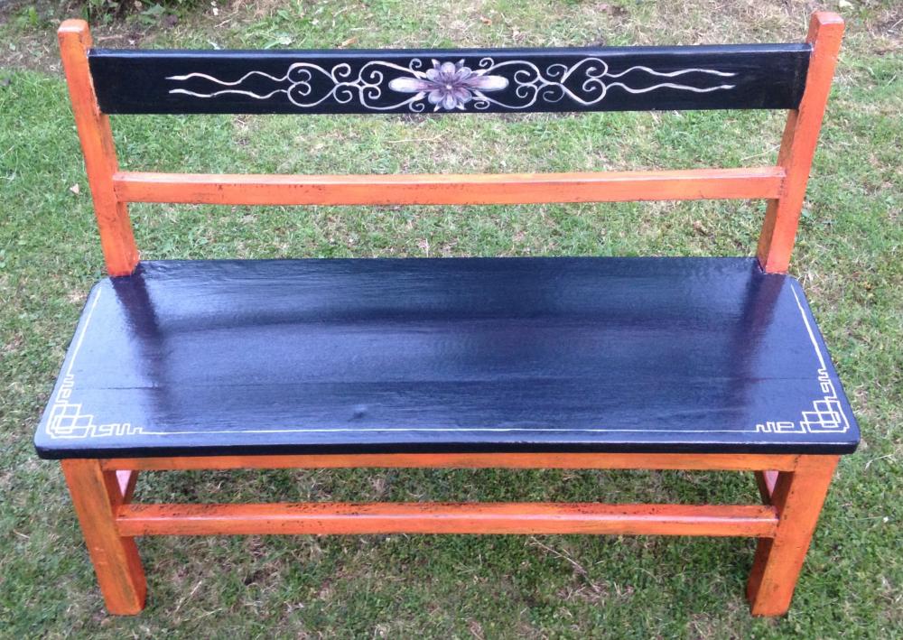 Hand painted low farmers double bench with backrest (86cm wide x 31cm deep x 62cm overall height and seat height 33cm). A pair is available