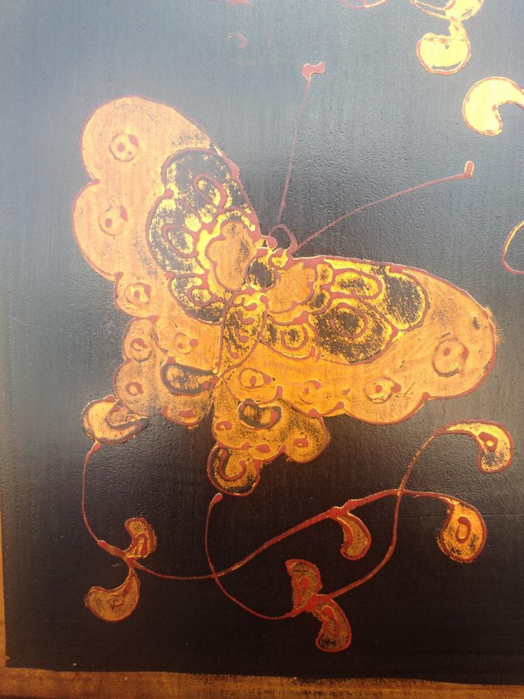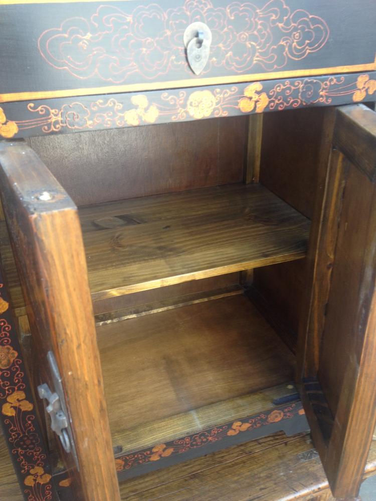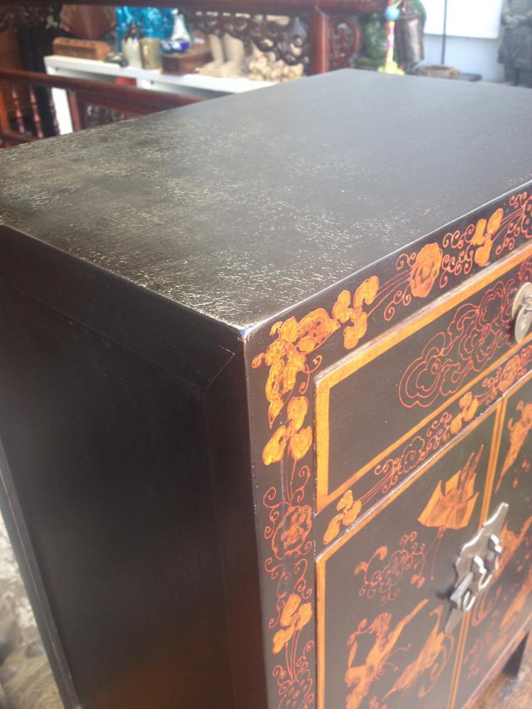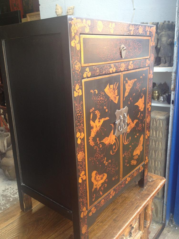 (Bedside) cabinet with cupboard, which has a removable shelf inside and single drawer above. Painted in black lacquer with hand painted butterflies. Scratch resistant top.