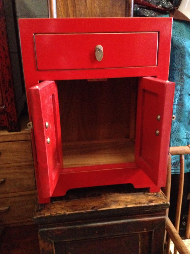 Small reproduction bedside cabinet with cupboard and single drawer above. Made to a very high standard and finished in high gloss red lacquer.