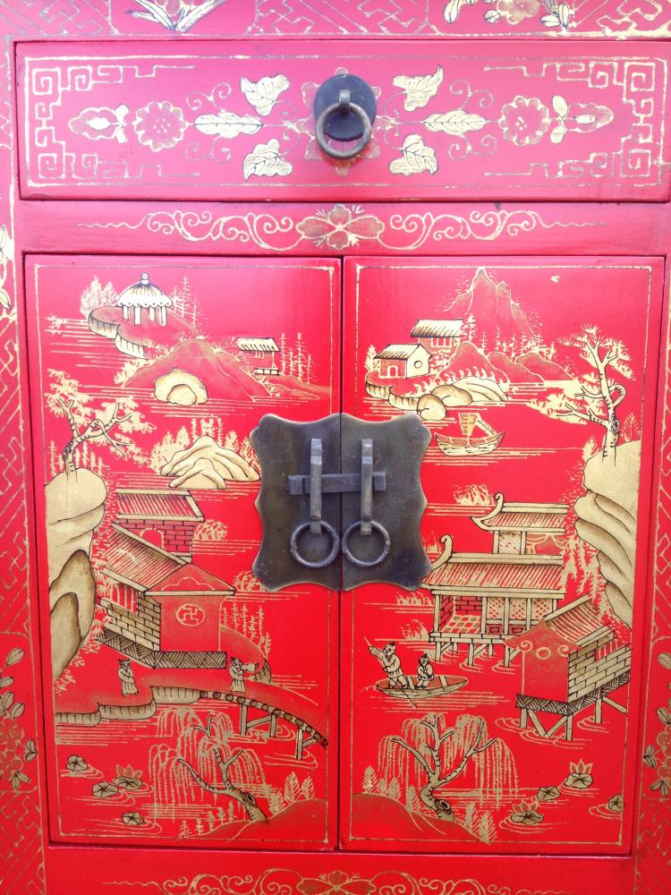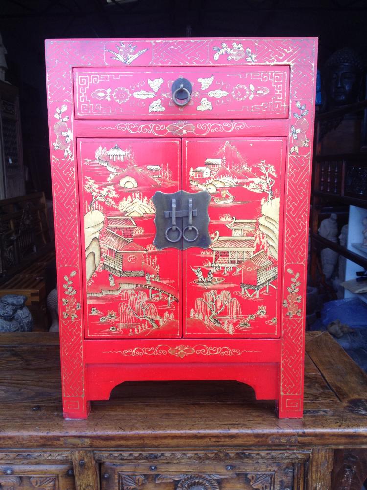 One drawer, two door bedside cabinet, bright red lacquered depicting Chinese oriental scene in gold relief.
