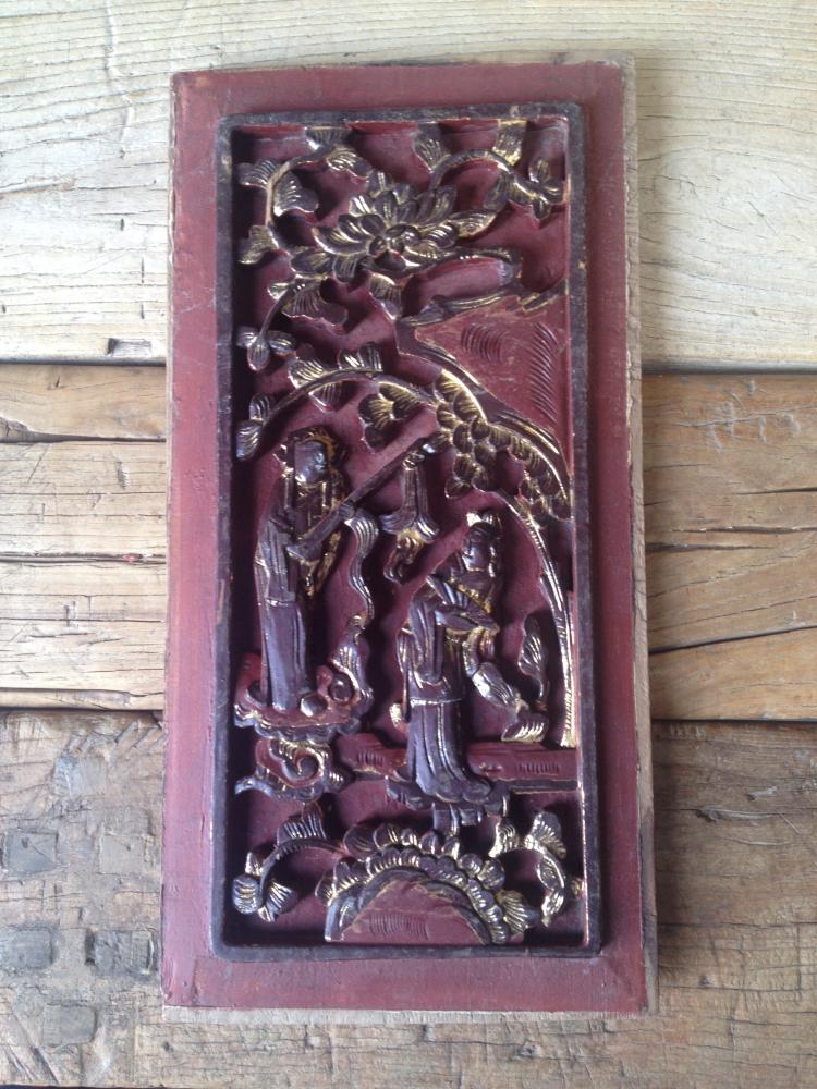 Hand carved wood door panel with lacquered finish would have been in a door or window. Probably dates back to pre 1900.