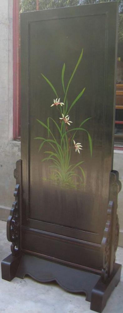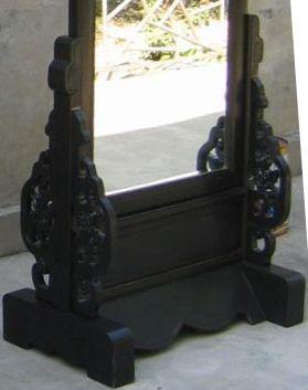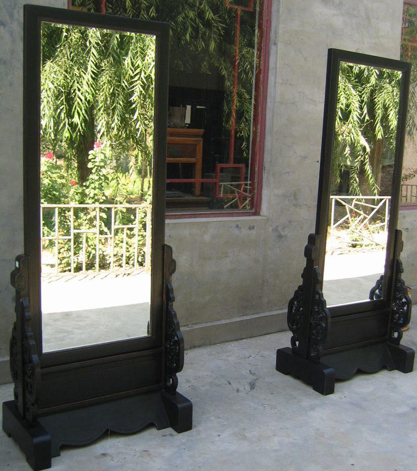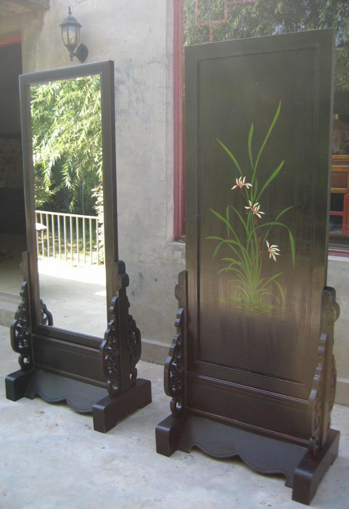 A beautiful freestanding full height bedroom mirror finished in black. Reverse side painted in typical Chinese style.