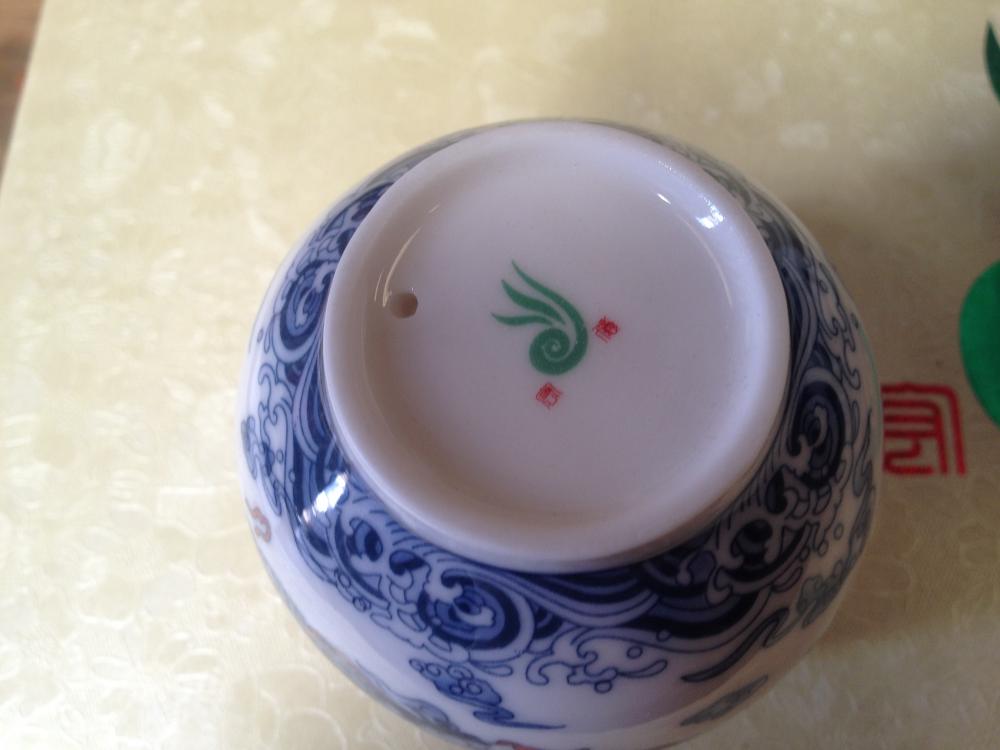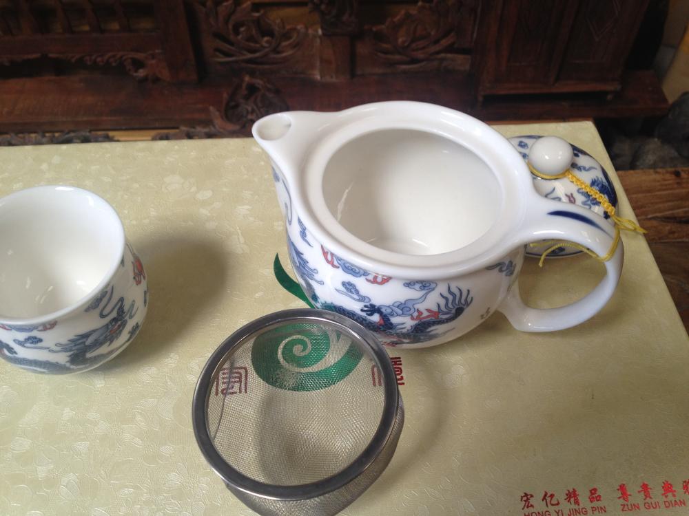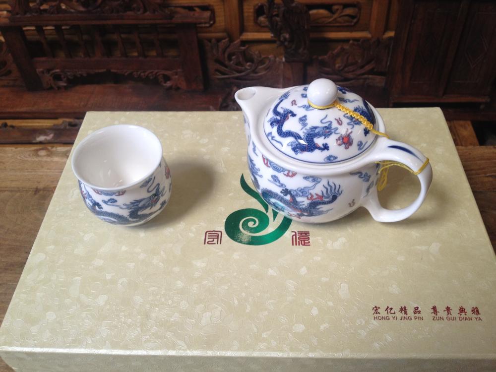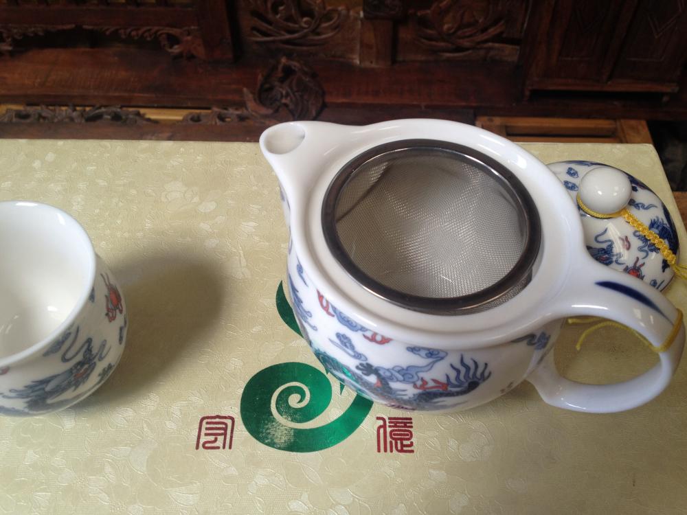 Chinese ceramic tea set decorated with dragons in blue and red on white background. The cups are double skinned such that whilst the tea is kept hot the cup is cool to the touch.
