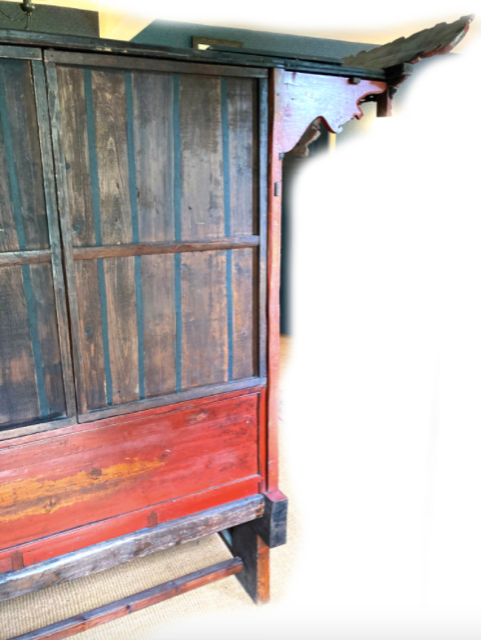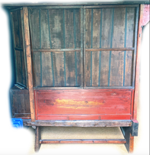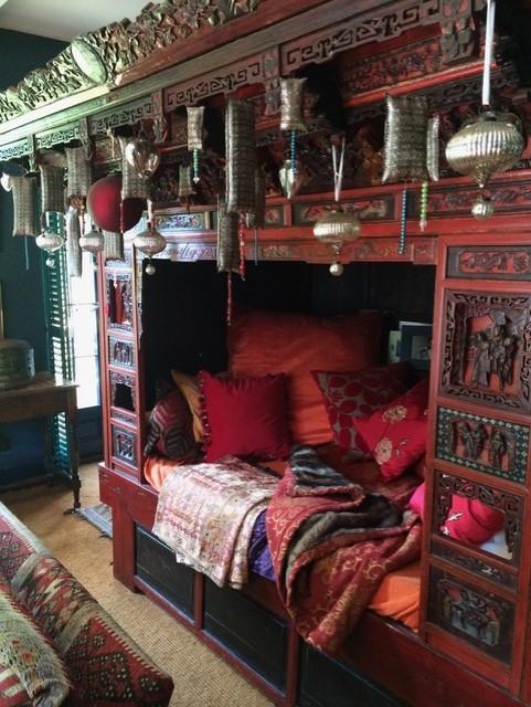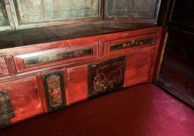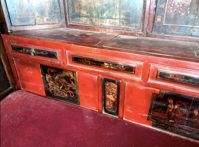 Qing dynasty wooden Chinese wedding bed / opium bed, dated late 19c-early 20c. Interior features painted panels (including ceiling) and drawers below a shelf set at the back. Includes both carved decorative design alongside painted and gilt decorative figures, creatures and auspicious and good-luck symbols. Formed of interlocking and pegged panels. A modern-day red velvet made-to-measure mattress is included.