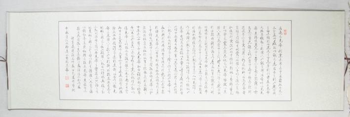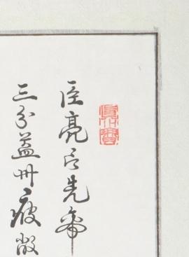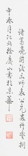 Extract from 'Chushibiao' by Zhu Geliang. This representation is hand drawn and signed by artist Xu Qingshan. Drawn in ink with brush on painting parchment and mounted on textured, green mount.
