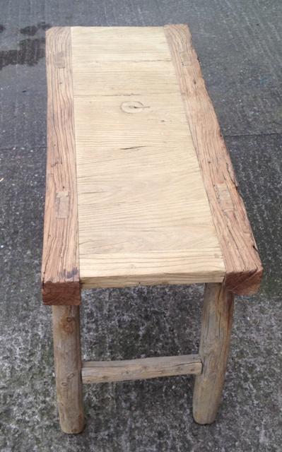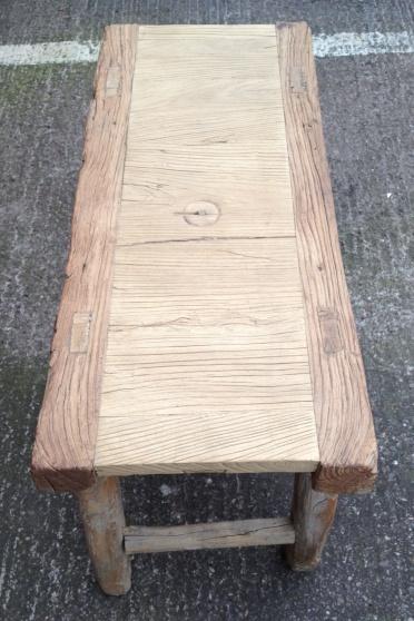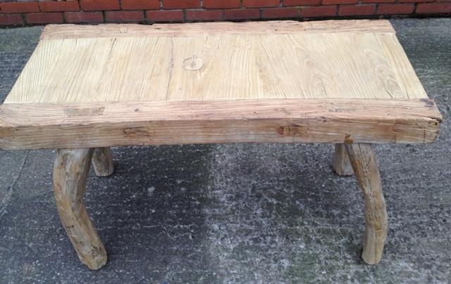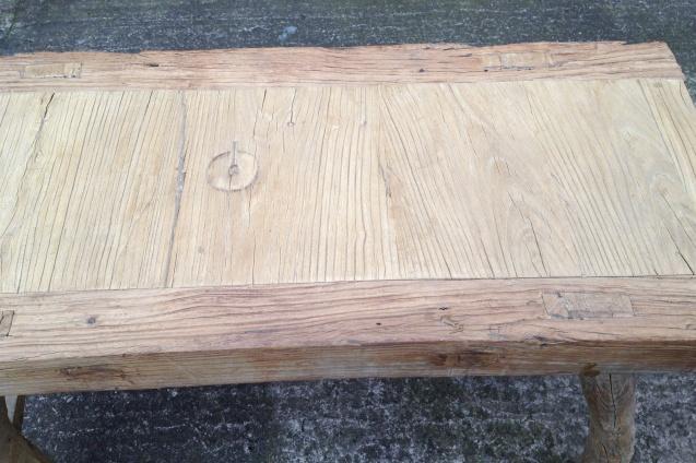 Farmer's table in old, unfinished elm. Heavy built up top jointed to naturally curved legs with brace.
