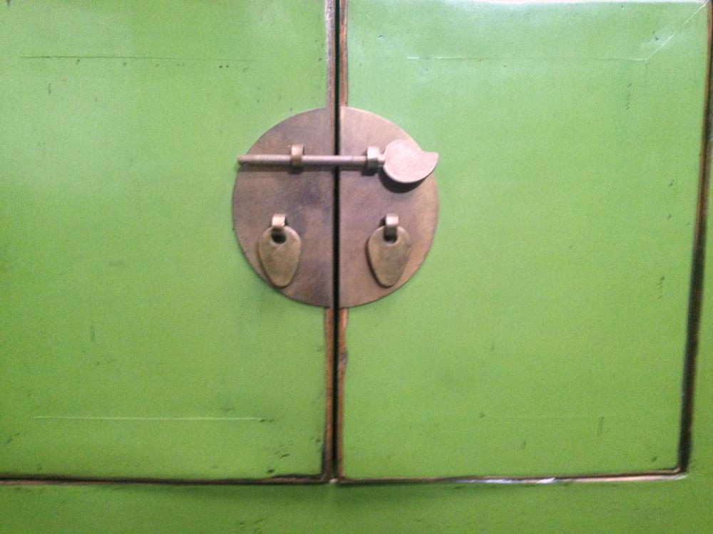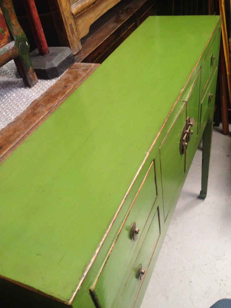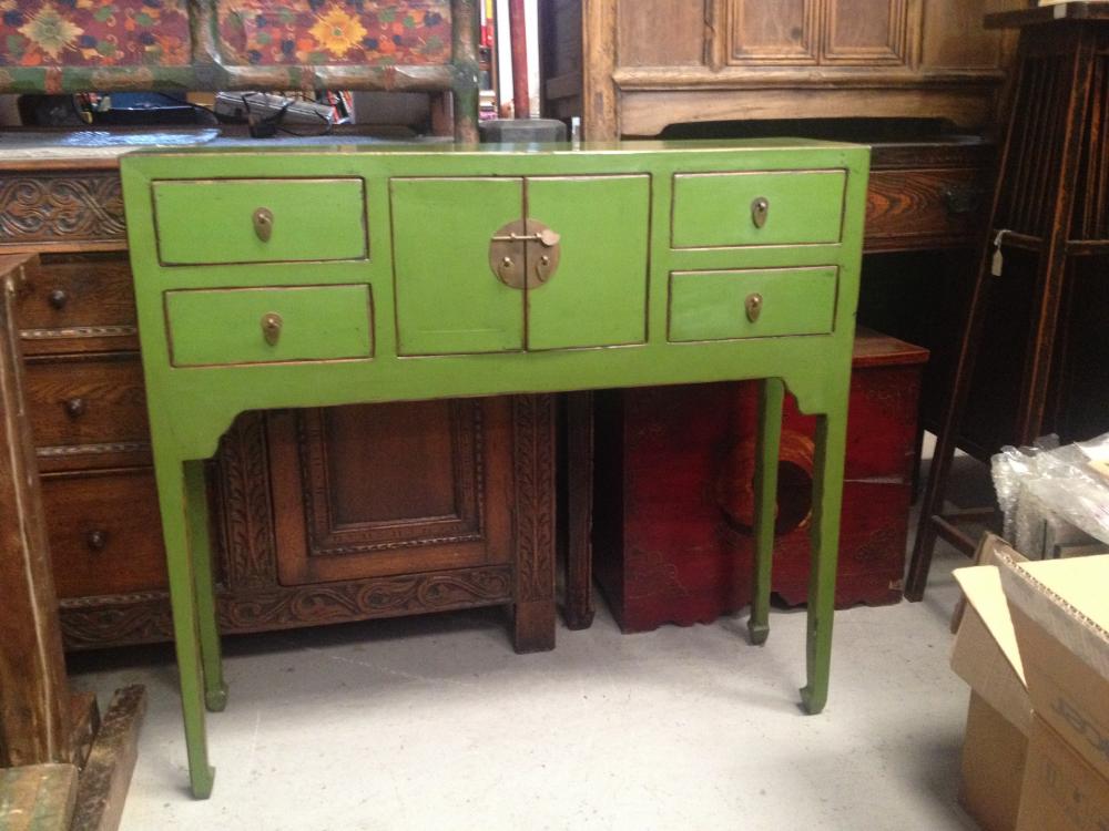 Reproduction side table with cupboard space and four drawers. Made of elm and finished in coloured lacquer.