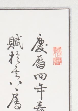 Prose entitled Yue Yang Lou Ji hand drawn and signed by artist Xu Qingshan. Drawn in ink with brush on painting parchment and mounted in textured, green mount.