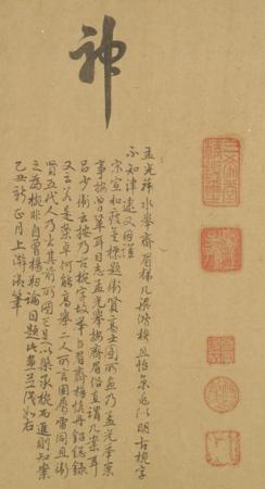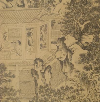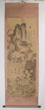 Watercolour print depicting buildings within landscape and calligraphy 60x187cm