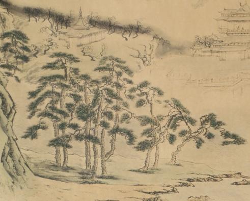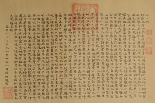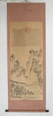 Watercolour print depicting landscape scene with calligraphy 57x165cm