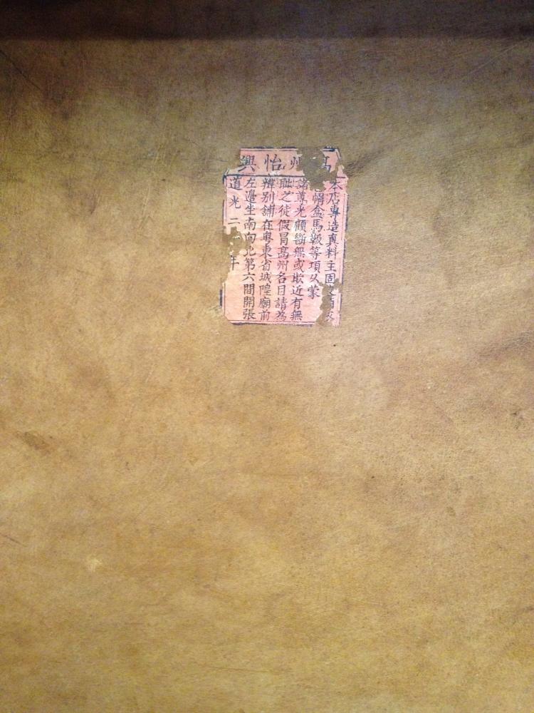 The lable inside the trunk talks about their leather trunk business, based in Gaoshou, Guangdong province,starting in the Qing Dynasty (1644-1911). It also warns customers about copies of their trunks which are not of the same quality or standard!
