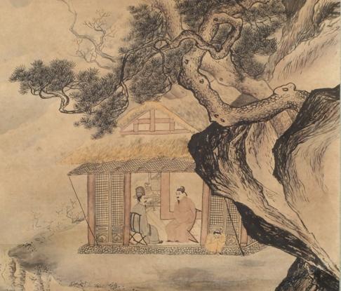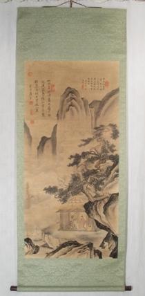 Watercolour print depicting building in landscape. Watercolour painting on painting parchment mounted on subtly pattened and textured, green coloured mount.