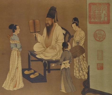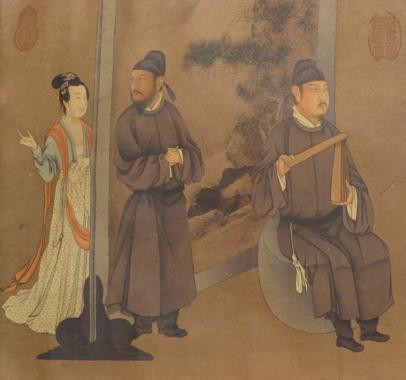 Watercolour print depicting Tang Dynasty court scene with musicians. Watercolour painting on painting parchment mounted on subtly pattened and textured, steel coloured mount.