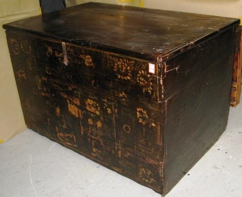 Hand painted Shanxi chest. The brilliant painting is somewhat faded but now protected with a thin varrnish coat. In good condition.