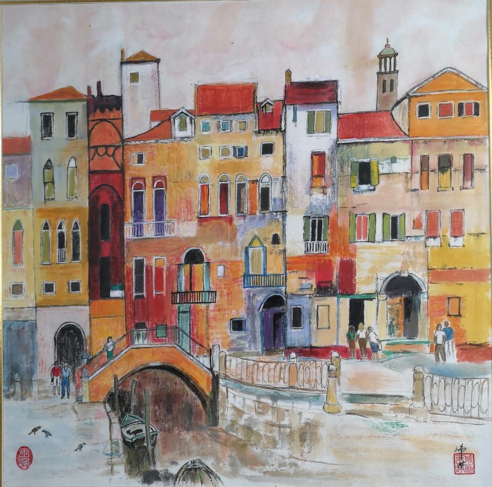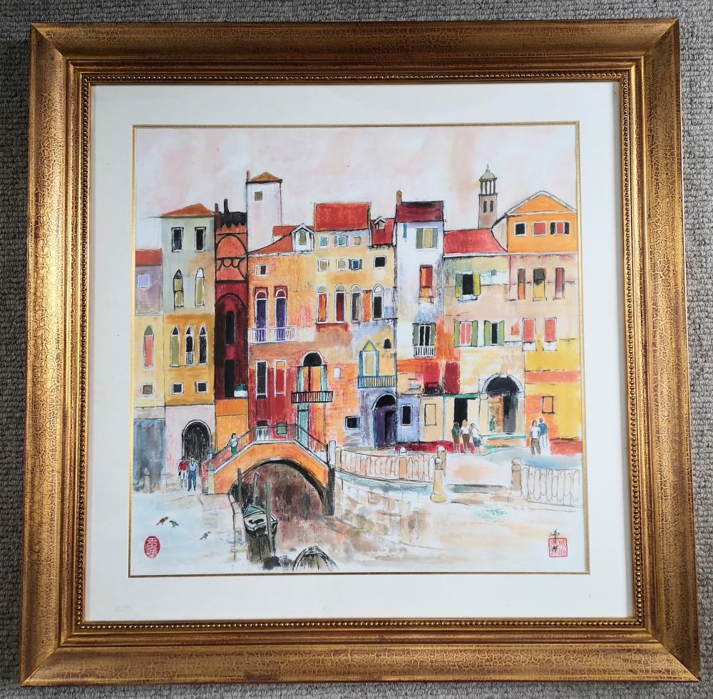 Original ink & watercolour painting of Venice with calligraphy brush on Xuan paper 67 x 67cm (framed)